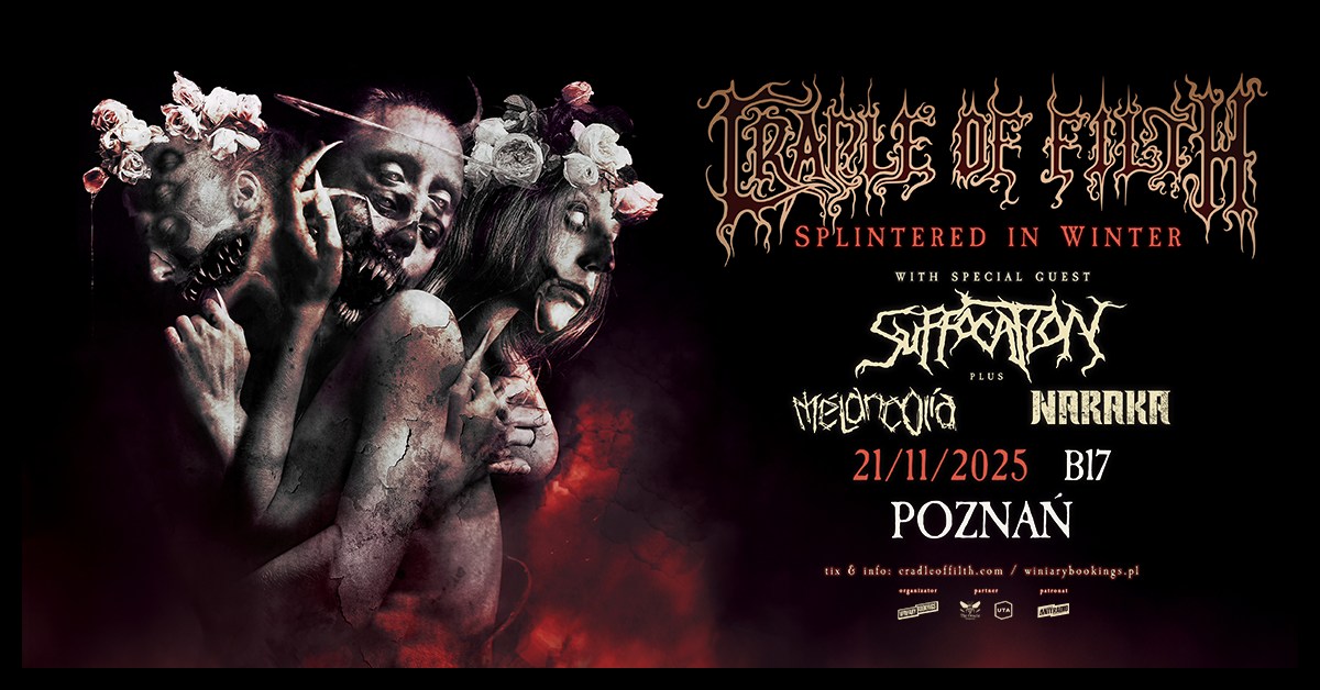 Poznań szykuje się na jedną z najważniejszych metalowych imprez tej jesieni. 21 listopada w legendarnym klubie B17 spotkają się wielcy mistrzowie mrocznej ekstremy i śmiercionośnego death metalu. Brytyjscy ikonoclasci ekstremalnego metalu, Cradle of Filth, przyjadą promować swój najnowszy, czternasty już album zatytułowany „The Screaming of the Valkyries”. W roli specjalnego gościa wystąpi amerykańska legenda brutalnego death metalu – Suffocation, a całość uzupełnią dwie wyjątkowo ciekawe formacje stanowiące znakomite uzupełnienie wieczoru – australijska nu metalowa ekipa Mélancolia oraz francuska mieszanka nowoczesnego i melodic death metalu, z którą każdy miłośnik ciężkich brzmień powinien się zapoznać – Naraka.