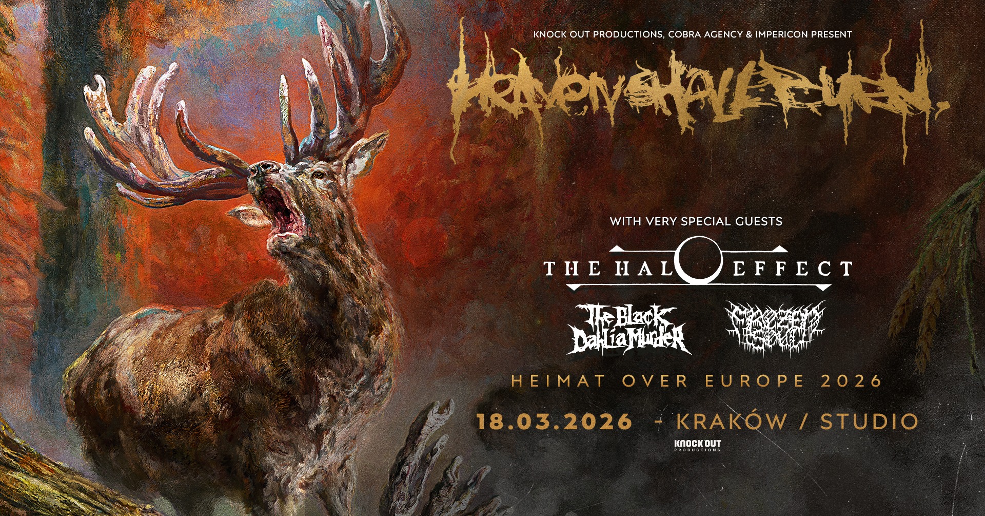 Kalendarium: 18 marca — Kraków, Klub Studio. Start wieczoru: wieczorem (szczegółowe godziny i rozkład setów dostępny u organizatora). Bilety i druki kolekcjonerskie: knockoutmusicstore.pl (druki kolekcjonerskie / collector’s tickets) oraz ebilet.pl. Organizator: Knock Out Productions (www.knockoutprod.net). Prosimy o kupowanie wejściówek wyłącznie w autoryzowanych sklepach wymienionych powyżej; pełny regulamin wydarzenia dostępny jest na stronie organizatora.