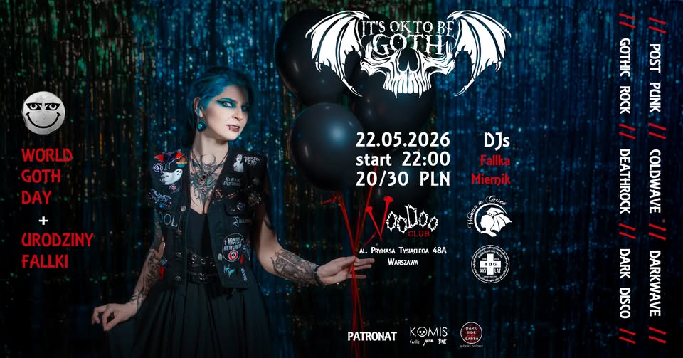 Zapraszamy na wyjątkową edycję cyklu „It’s OK To Be Goth”, która odbędzie się 22 maja 2026 roku w warszawskim VooDoo Club. To już 25. odsłona tego popularnego wydarzenia, które od początku 2024 roku cieszy się coraz większą sympatią miłośników gotyckiej muzyki i subkultury. Tym razem impreza zbiega się z obchodami Światowego Dnia Gota, co czyni ją jeszcze bardziej wyjątkową. Organizatorzy przygotowali muzyczną ucztę pełną mrocznych brzmień, od post-punku i rocka gotyckiego, przez deathrock, coldwave, aż po darkwave.