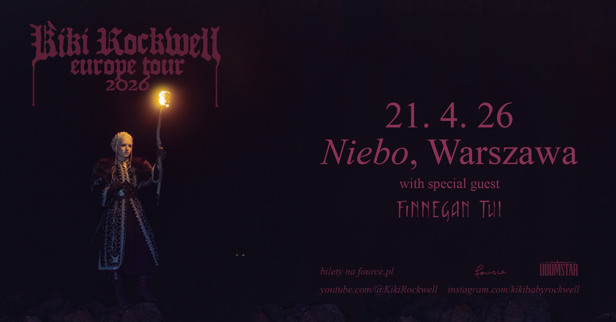Kalendarium: Support: Finnegan Tuinn; Oficjalne kanały sprzedaży: fource.pl (https://fource.pl/pl/events/kiki-rockwell-26), eBilet (https://sklep.ebilet.pl/adwv/254453378946433336), Ticketmaster Polska (https://www.ticketmaster.pl/event/982246195). Dokładną czasówkę (timetable) organizatorzy podadzą w tygodniu, w którym odbędzie się wydarzenie.