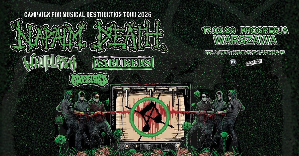 17.02.2026 — Warszawa, Progresja: NAPALM DEATH + Whiplash (USA) + The Varukers (Wielka Brytania) + Dopelord (Polska). Bilety: https://bit.ly/NAPALM_DEATH_WWA. Punkty sprzedaży: www.winiarybookings.pl, Going, Empik Bilety, Eventim, Ebilet, Ticketmaster. Wstęp 13+ za pisemną zgodą rodzica (wzór zgody: https://bit.ly/pisemna_zgoda_rodzica_wb). Regulamin wydarzenia: https://bit.ly/regulamin_wydarzenia_wb. Organizator apeluje o kupowanie wejściówek wyłącznie w autoryzowanych punktach sprzedaży.