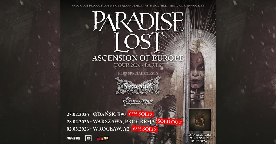 Już 27 lutego 2026 roku w gdańskim klubie B90 odbędzie się niezwykłe wydarzenie muzyczne, które z pewnością przyciągnie fanów mrocznej i ciężkiej muzyki z różnych zakątków Europy. Na scenie wystąpią trzy znakomite zespoły: brytyjscy posępni doom/gothic metalowcy Paradise Lost, duńscy melodyjni death/doom metalowcy Saturnus oraz włoscy black/doom metalowcy Shores of Null. To będzie wieczór pełen mrocznych brzmień, głębokich emocji i niezapomnianych doznań muzycznych.
