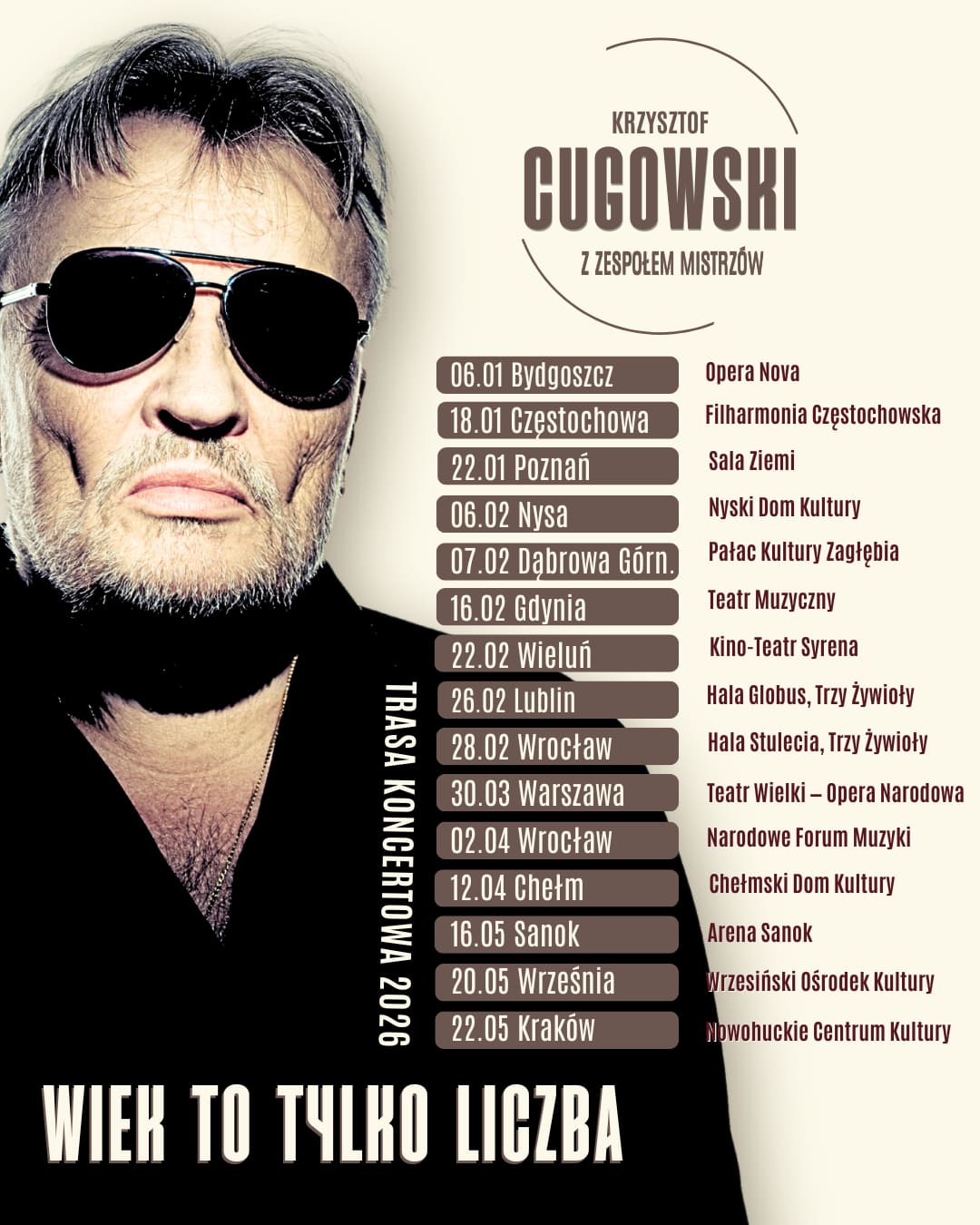 Krzysztof Cugowski – artysta kompletny, legenda polskiej sceny, głos pokoleń, którego czas się nie ima. W 2026 roku wyrusza w kolejną wielką trasę koncertową, bo przecież WIEK TO TYLKO LICZBA.
